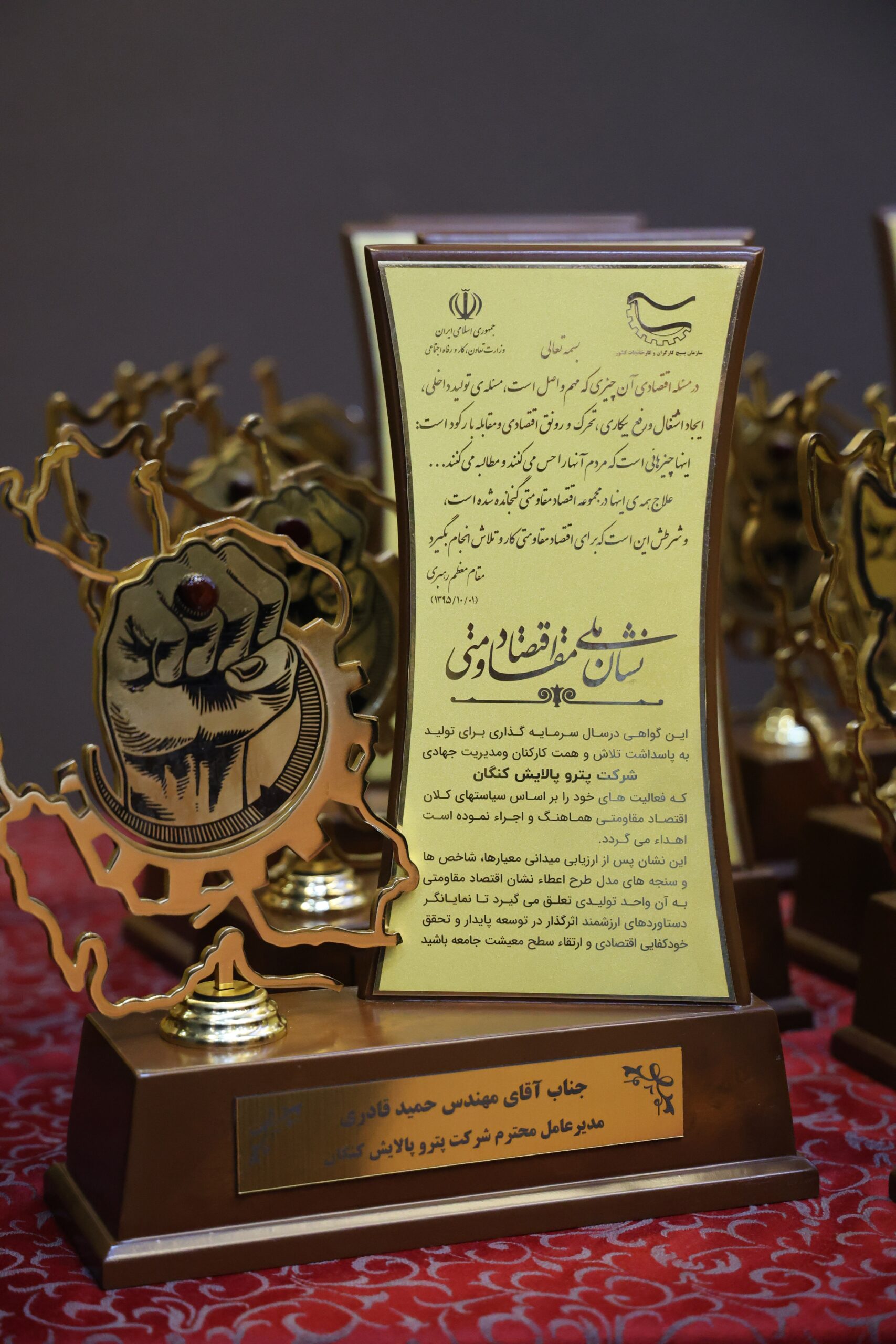 جشنواره ملی نشان اقتصاد مقاومتی با حضور مقامات عالیرتبه وزارت تعاون، کار و رفاه اجتماعی و سازمان بسیج کارگران و کارخانجات کشور، با هدف الگوسازی در عرصه تولید ملی برگزار شد. در این رویداد ملی، شرکت پتروپالایش کنگان موفق به کسب تندیس نشان ملی اقتصاد مقاومتی شد.
